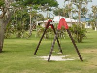 | オクマのプライベートビーチは、子供が十分な遊べるほどの遠浅ではありませんでした。水の透明度も私が行ったときには濁っていました。前の週の雨が原因らしいです。よって、すこ〜しだけ海で遊んでから、ほとんどプールに入ってました。 ビーチで遊べるようにと、パラソルとチェアーも借りました(有料:4時間で1600円程度)が、最初の1時間ほど砂遊び(珊瑚遊び?)をしたくらいで、あまり使わないまま返すことになってしまいました。 プールは、流水プールと大きめのプール(一部分が子供用の水深になってます)がありました。プールサイドのチェアー類は早い者勝ちということで、余っていたのは日当たりの良い場所でした。すぐ近くに監視員もいるので、安心して遊べます。そのお兄さんに頼んで、子供用の腕につける浮き輪を借りました。が、娘はつけるのを嫌がってましたが・・・。少々怖がりの娘は、結局子供用のプールでしか遊びませんでした。