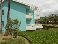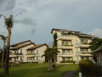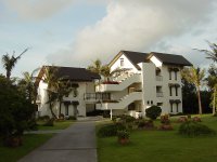 初めて訪れたのでフロントの位置も分からないまま、駐車場に車を止め、スーツケースを長い距離ガラガラと転がしました。ニューコテージの前を通り、セレナアネックス前を通過して、やっとフロントが見えてきました。ここまで車で来れば、大きな音を立てず、大変な思いもせずに済んだのに・・・。 フロントで一通りの案内を受け、部屋が23○であることが判明。「メインコテージの一番奥です」とあっさり言われました。後で分かったことですが、距離にすると結構あります。チェックイン時は、カートに乗せてもらいました。その後、何度となくフロント付近から部屋までを行ったり来たりするわけですが、ブランコやハンモックで遊んだりして自然の雰囲気を満喫しながら芝生の上を歩いたので、この距離は苦になりませんでした。部屋に入ると、上の階がない部屋だったので天井も高く、きれいな部屋でした。この日は、ランドリー場所のチェックを済ませるだけで、すぐに寝てしまいました。