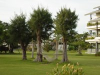 | 翌朝、5:00頃に蝉の鳴き声で目を覚ましました。これがスゴ〜イ音なのです。朝イチで洗濯をしに行くと、周囲の木には幹が黒くなるほどの蝉がとまって鳴いておりました。洗濯中に一回り散歩をしていると他にもランドリー1ヶ所、ブランコなどを見つけ、各コテージの様子が分かってきました。ハンモックも見つけて寝転んでみました。 「カフェセレナ」でおいしい朝食を取りました(内容については「オクマの食事」の項目で)。その後、娘とビーチへGO! 妻はリラグゼーションへ。ちなみに、妻の予約はこの日の朝の時点でしたが、午前中はすでに予約でいっぱい、昼過ぎに取ることができました。また、フロントへ出かけて、明日(3日目)の夕食の予約も入れておきました。 プールに入り、2時間ほどで部屋へ戻りました。この日の昼食は、オクマ滞在者の間で話題の「パーラー三角」へ。ホテルのフロントに電話で場所を確認したところ、「国道方面ではない方へ、フロントから右方面へ行くと、右側にあります」と教えてくれました。遠くの駐車場まで車を取りに行き、走ること数分で見つけました。 話題になっていなければ、絶対に通り過ぎてしまうほどの小さなお店でした。チキンバーガーを注文すると、そこからパン粉をつけて揚げていました。当然すぐには食べられない熱さでした。ボリュームがあり、200円とは思えないほどのものでした。