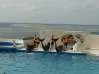 | タコスを食べて、そのままオクマへではなく、限られた日数を考え1日目に水族館に行ってしまおうと考え、名護経由で海洋博に向かいました。 途中、許田の道の駅に寄って割引券(大人1800円→1550円)を手に入れ、向かいました。金武から1時間弱で到着、まずはイルカのショーを見て割引券を手に水族館へ。数年前と比べると更に立派になってました。 |