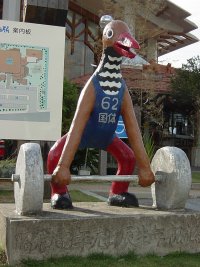 厳密には、オクマの設備ではありませんが、近くのコンビニについて書きます。国道のオクマ入り口に○ァミりー・○ートがあります。通常の(と言うのもおかしいですが)雑誌類やお菓子、ちょっとした雑貨などがあり、便利だと思います。お弁当類ももちろんありますが、通常のお弁当の他に沖縄らしいタコスやタコライス巻き、あぶら味噌のおにぎりなどもありました。酒類も扱っているので、重宝します。JALオクマから車で2〜3分、自転車で7〜8分かと思います。歩くとちょっと距離があるかも・・・。 で、その隣が「ゆいゆい国頭」です。道の駅のようなものだと思ってください。お土産や食事ができるところがあります。ここで怪しいヤンバルクイナを見かけたので、写真を撮りました。(→) |