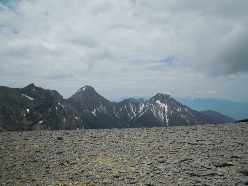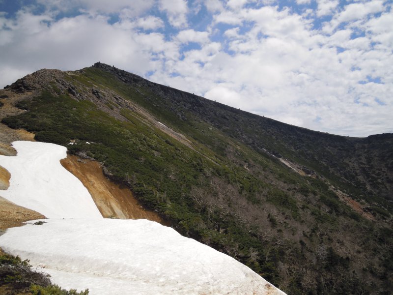 硫黄岳から向こうの下りのケルンが見えます。