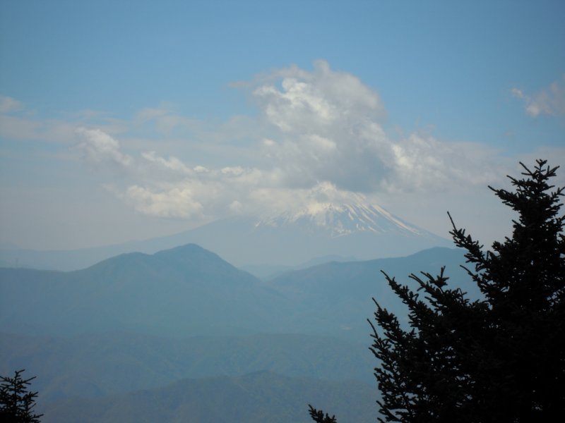 左に、雲をかぶった富士山が見えます。
