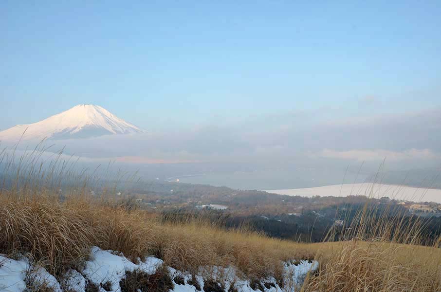 右手に、手前側が半分白く凍った山中湖が見えます。