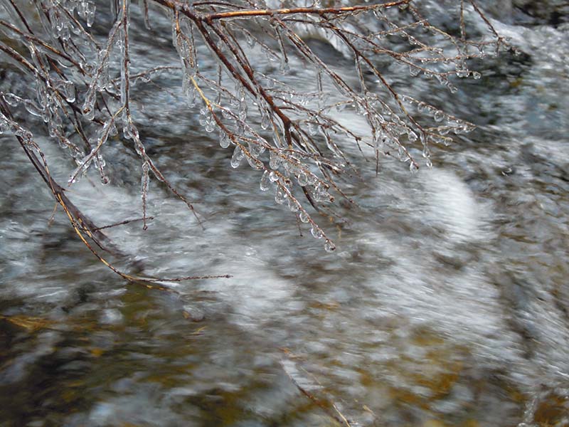 上にある木の枝に水滴がついて、氷になってました。