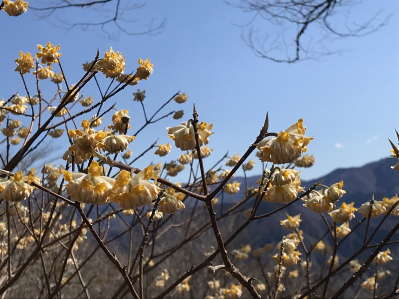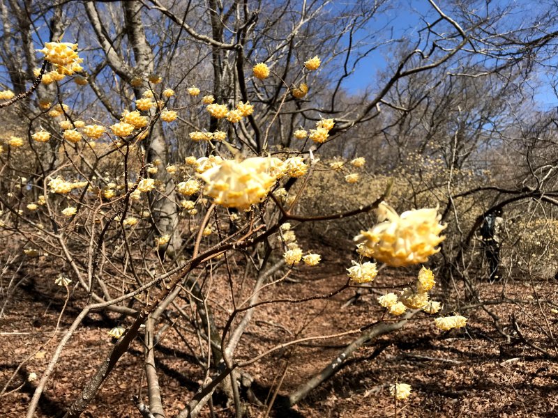 登り始めて、約1時間で山頂です。手前からミツマタが咲いてました。