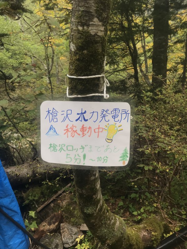 13:20 槍沢ロッジ手前です。「〜10分」が面白いです。後から追加した情報でしょうね、個人差が出る場所ですから。