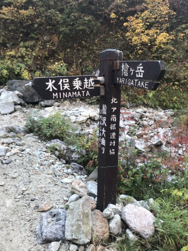 6:40 今回の大本命、槍に向かって出発→7:08 槍沢大曲りです。水俣乗越への分岐です。