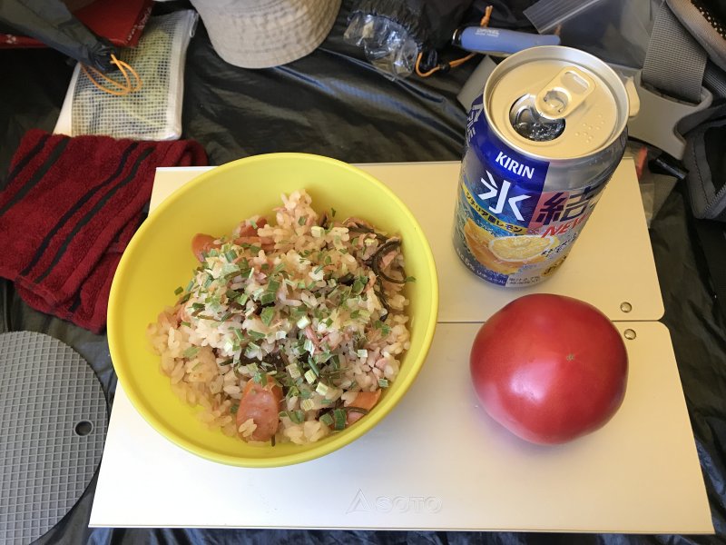 ツナ、塩こんぶ、チョリソーの炊き込みご飯、とトマトでした。