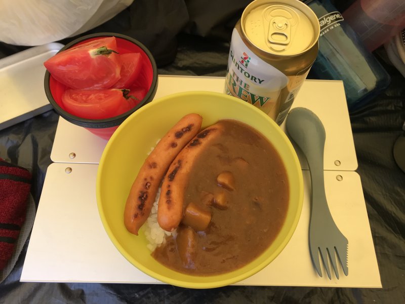 トマトとビールを冷やし、ご飯を炊き、チョリソーを焼き、レトルトカレーを温め、夕食です。