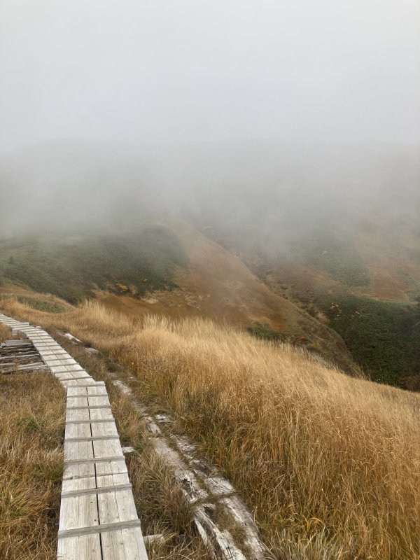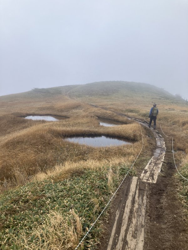 10:45 木道が出てきて、辺りがガスで白くなってきました。