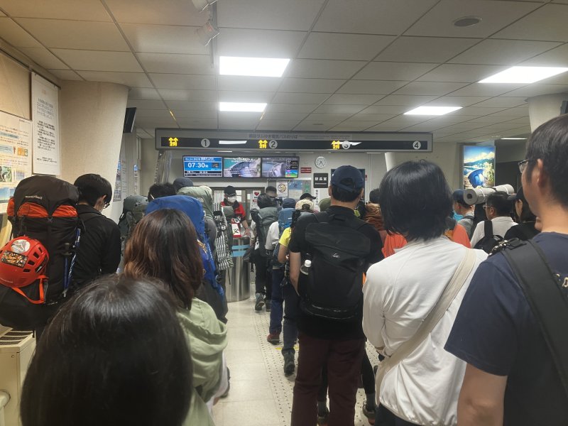 6:40 朝の扇沢駅です。発車時刻より前からチケット売り場に並んでますが、