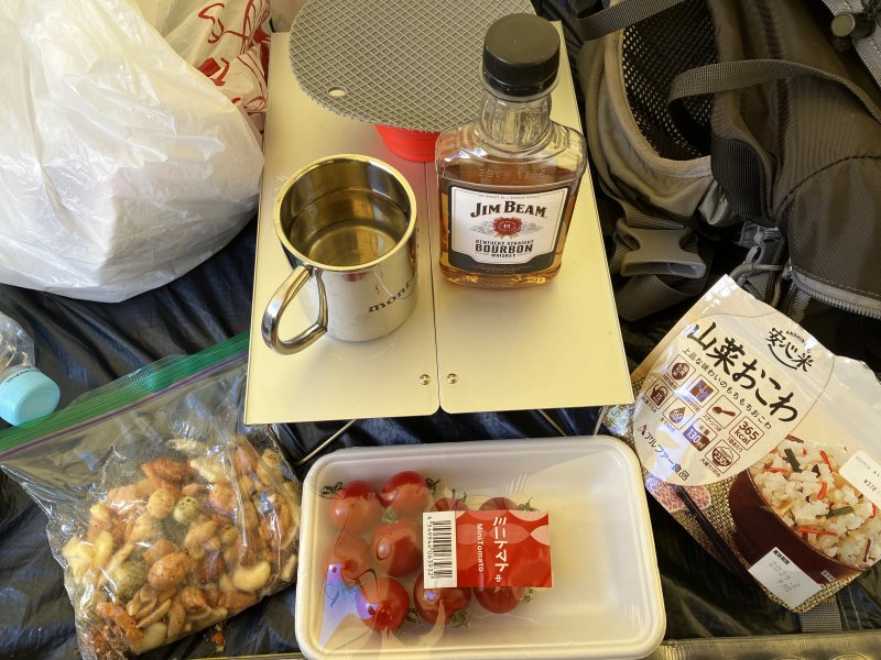 流水うどん・パン・水で戻せるアルファ米・きゅうり・ミニトマト・行動食でしのぎ、